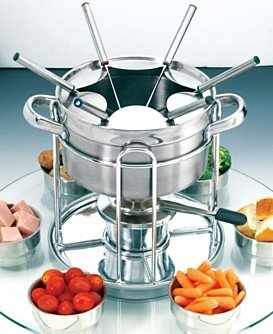 Cheese fondue is a traditional Swiss dish, fun to serve and enjoyable to eat. This traditional style cast iron cheese fondue set includes a red cast iron fondue pot, a black wrought iron warming stand, six cheese fondue forks and a dual function burner. The pot is enamelled inside and provides even heat distribution. It can be used on all heat sources and is easy to clean. 8.25 inches w. x 7 inches h. Capacity - 2 Qts.